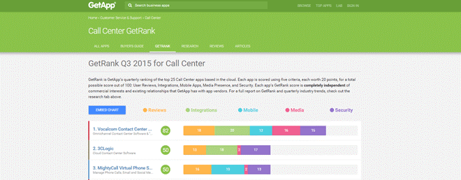 GetApp es una compañía de Gartner especializada en conectar a las organizaciones con las aplicaciones empresariales que necesitan. Presentó, recientemente, su ranking trimestral de las 25 principales aplicaciones basadas en la nube para Contact Centers, GetRank, en el que Vocalcom ocupa el primer puesto, por tercer trimestre consecutivo, en la categoría de software para Contact Centers y con una valoración total de 82 puntos.