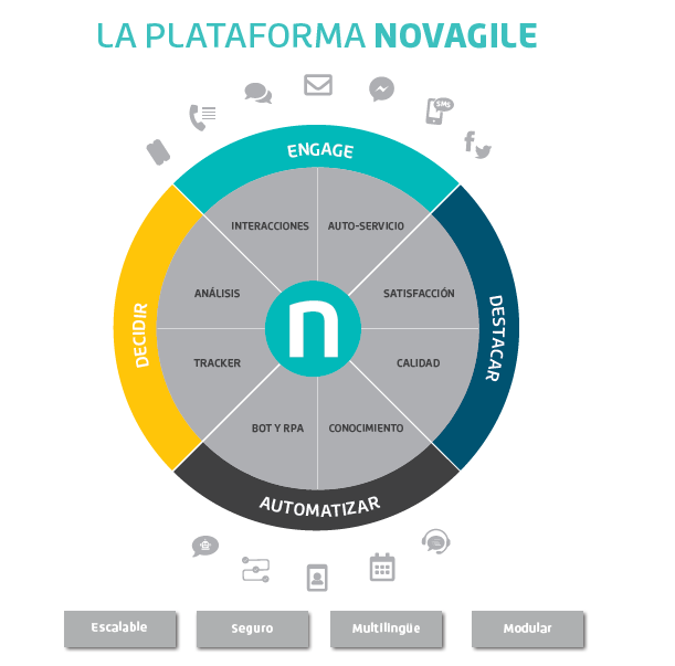 Novagile nace para solucionar la necesidad de agilidad y flexibilidad de las operaciones de contact center. Con una interfaz unificada, la herramienta permite tener una visión 360° de las interacciones a través de cualquier canal (email, web, chat, redes sociales, chatbot, Facebook Messenger … ) ofreciendo control en tiempo real, gracias a la analítica que aporta la solución para entender al consumidor.