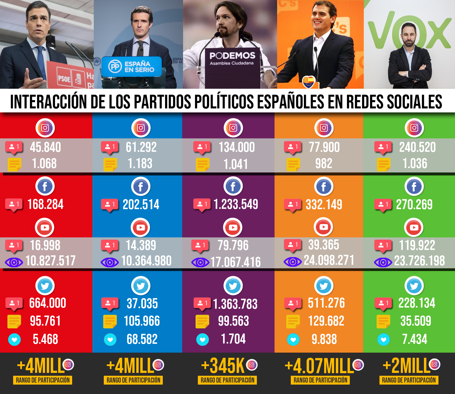 Desde hace tiempo, las redes sociales han representado el segundo entorno para el campo político a la hora de procesos electorales e interacción con el electorado. Madzuli Agency, agencia belga de marketing digital 360º, ha realizado un estudio para analizar los perfiles de los partidos políticos españoles (PSOE, Partido Popular, Podemos, Ciudadanos y VOX) en redes sociales y la interacción con su público objetivo, basándose en distintas métricas.