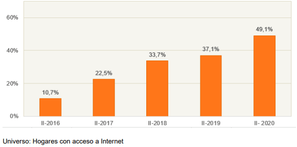 La CNMC ha analizado el consumo audiovisual de los españoles a través de plataformas online de pago, como Netflix, HBO o Amazon Prime Video. A mediados de 2020, este tipo de plataformas de pago estaban presentes en la mitad de los hogares con acceso a Internet. El crecimiento interanual fue de un 33%, según los últimos datos del Panel de Hogares CNMC del segundo trimestre de 2020.