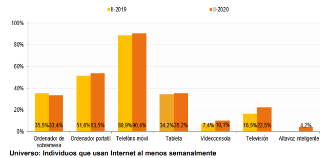 Es importante destacar que los datos de esta encuesta reflejan la situación de mercado durante la pandemia de COVID-19 (trabajo de campo realizado en mayo y junio). Los resultados del Panel también confirman el uso intensivo del móvil para conectarse a Internet: 9 de cada 10 internautas lo hace de manera habitual. Por cierto, en esta oleada aparece por primera vez el altavoz inteligente como dispositivo de conexión.
