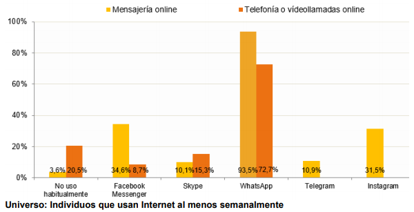 Whatsapp continúa siendo el principal proveedor de servicios de comunicación online: un 93% de los usuarios habituales de Internet usa este servicio para mandar mensajes online y un 73% para efectuar llamadas o vídeo-llamadas.