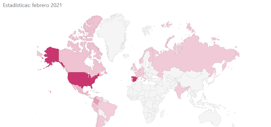 Seguimos creciendo en Febrero, hemos crecido un +80% sobre Febrero de 2020. Y aquí una imagen curiosa, de donde vienen mis usuarios, España, EE.UU y Colombia son mi Top3