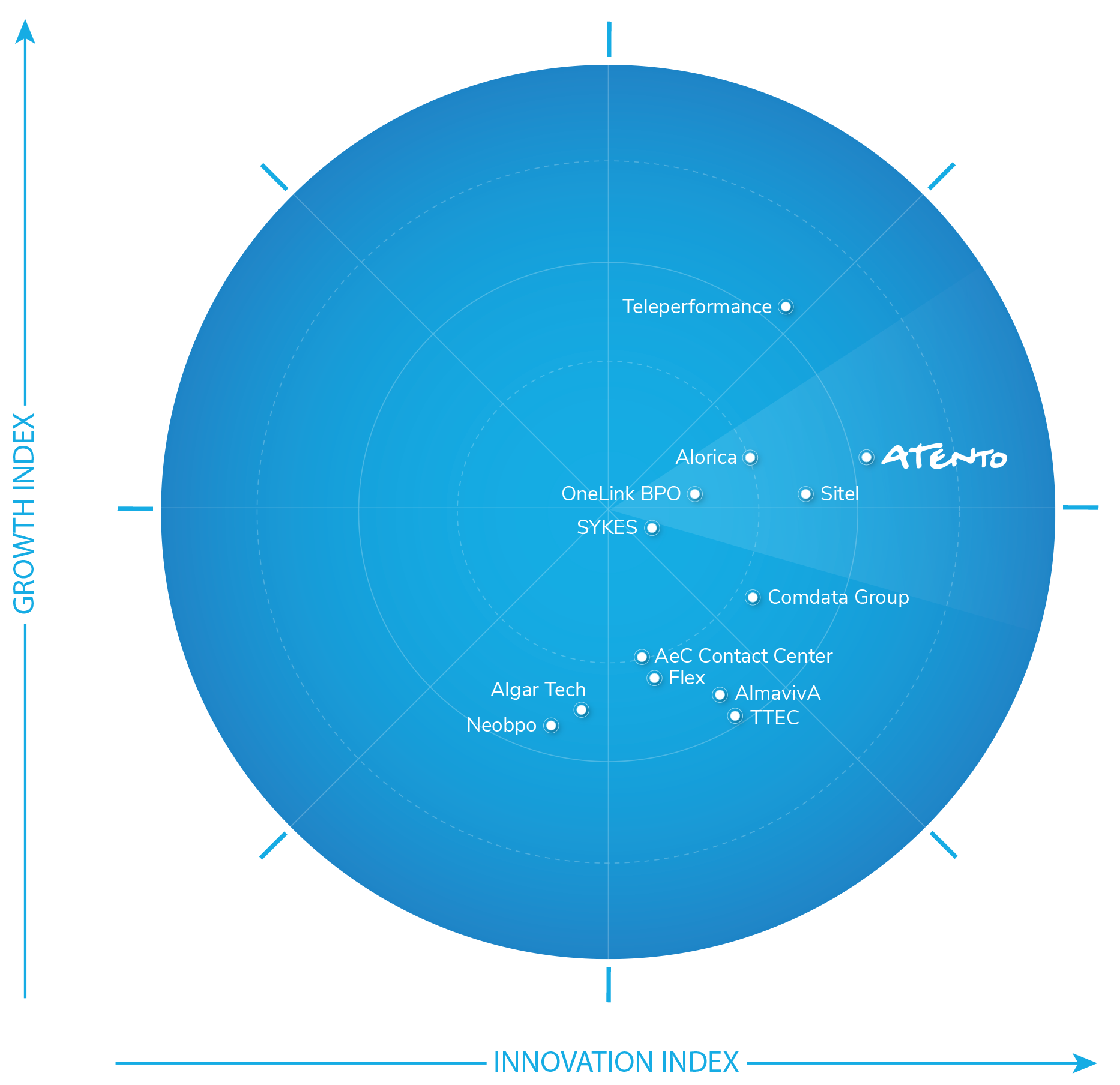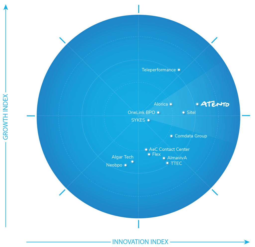 Atento lideró el Radar de Frost en Innovación (puntuación de 4,5 sobre 5); obteniendo una puntuación por encima de la media en el Índice de Crecimiento. Frost & Sullivan ha reconocido a Atento como líder en el Mercado de Servicios de Outsourcing del Frost Radar™: por Customer Experience Outsourcing Services (Servicios externalizados de Experiencia del Cliente) en América Latina. Este reconocimiento premia la experiencia de Atento en el campo de CX como resultado de las continuas innovaciones que están llevando a cabo, lo que, combinado con el toque humano que proporciona la empresa, la posiciona como líder en la próxima generación de experiencia del cliente.