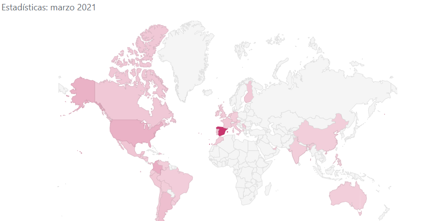 Seguimos creciendo en Marzo, hemos crecido un 80,7% sobre Marzo de 2020. Y aquí una imagen curiosa, de donde vienen mis usuarios, España, Colombia y EE.UU son mi Top3.