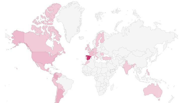 Seguimos creciendo en Mayo, hemos crecido un 105,5% sobre Mayo de 2021. Y aquí una imagen curiosa, de donde vienen mis usuarios. La zonas rosadas es donde he tenido visitas, hemos perdido Rusia pero nos asentamos en Latinoamérica. Mi top3 de este mes va para: España, Colombia y Argentina.