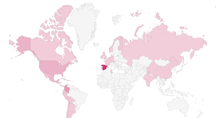 Este mes de Septiembre estamos estables a nivel de visitas, manteniendo datos semejantes a Agosto. Y aquí una imagen curiosa, de dónde vienen mis usuarios. La zonas rosadas es donde he tenido visitas, nos asentamos en Latinoamérica y Estados Unidos. Mi top3 de este mes va para: España, Colombia y Estados Unidos.