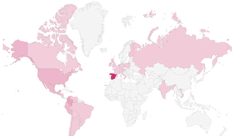 Este mes de Octubre estamos estables a nivel de visitas, manteniendo datos semejantes a Agosto. Y aquí una imagen curiosa, de dónde vienen mis usuarios. La zonas rosadas es donde he tenido visitas, nos asentamos en Latinoamérica y Estados Unidos. Mi top3 de este mes va para: España, Colombia y Estados Unidos.