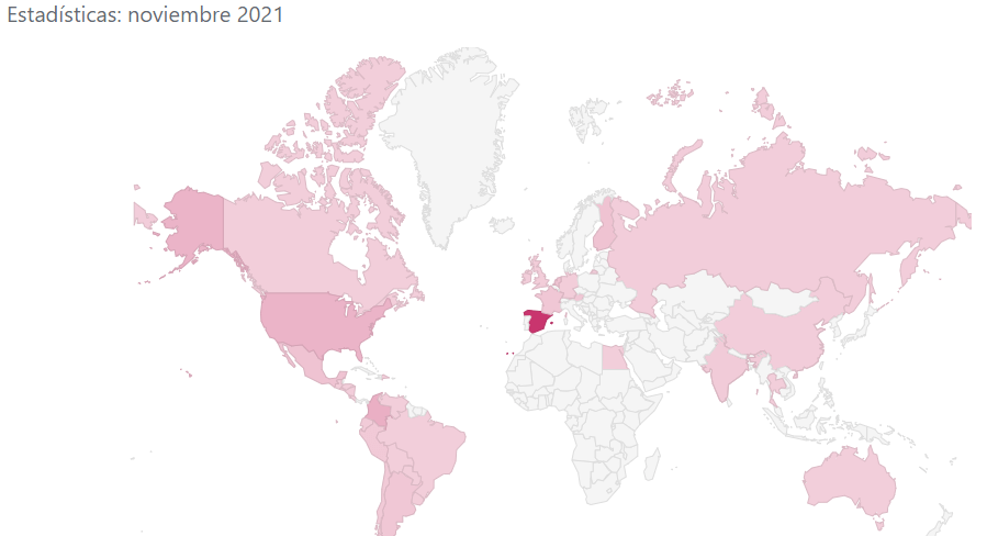 Este mes de Noviembre estamos estables a nivel de visitas, manteniendo datos semejantes a Octubre. Y aquí una imagen curiosa, de dónde vienen mis usuarios. La zonas rosadas es donde he tenido visitas, nos asentamos en Latinoamérica y Estados Unidos. Mi top3 de este mes va para: España, Colombia y Estados Unidos.