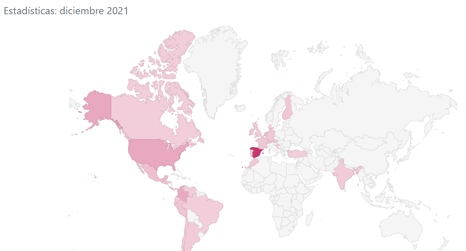 Este mes de Diciembre estamos estables a nivel de visitas, manteniendo datos semejantes a Noviembre. Y aquí una imagen curiosa, de dónde vienen mis usuarios. La zonas rosadas es donde he tenido visitas, nos asentamos en Latinoamérica y Estados Unidos. Mi top3 de este mes va para: España, Estados Unidos y Colombia.