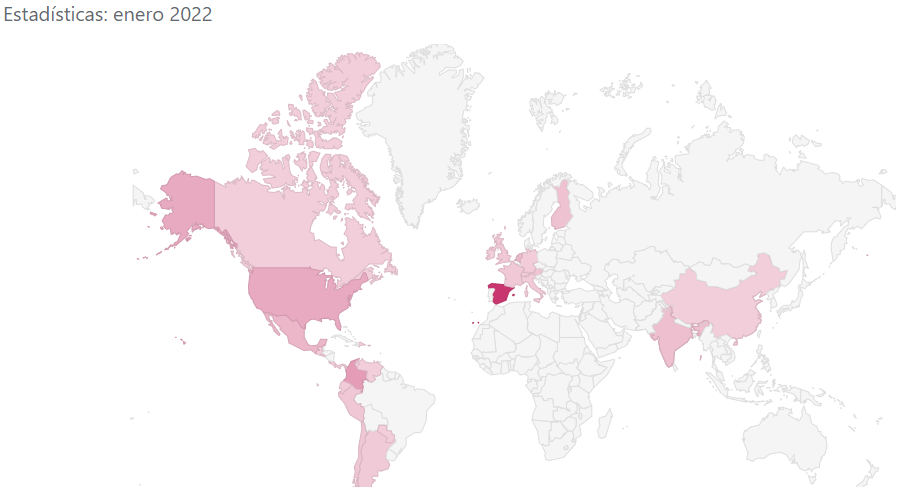 Este mes de Enero hemos crecido un 18,4% sobre 2021 y un 2,2% sobre el mes anterior. Así que muy contento por el crecimiento. Y aquí una imagen curiosa, de dónde vienen mis usuarios. La zonas rosadas es donde he tenido visitas, nos asentamos en Latinoamérica y Estados Unidos. Mi top3 de este mes va para: España, Colombia y Estados Unidos.