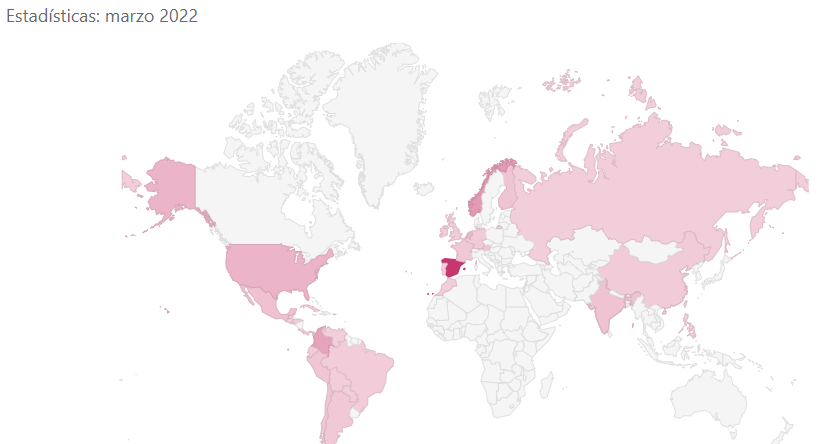 Este mes de Marzo hemos mantenido el crecimiento 2021 y sobre el mes anterior. Así que muy contento por el crecimiento. Y aquí una imagen curiosa, de dónde vienen mis usuarios. La zonas rosadas es donde he tenido visitas, nos asentamos en Latinoamérica y Estados Unidos. Mi top3 de este mes va para: España, Noruega y Colombia.