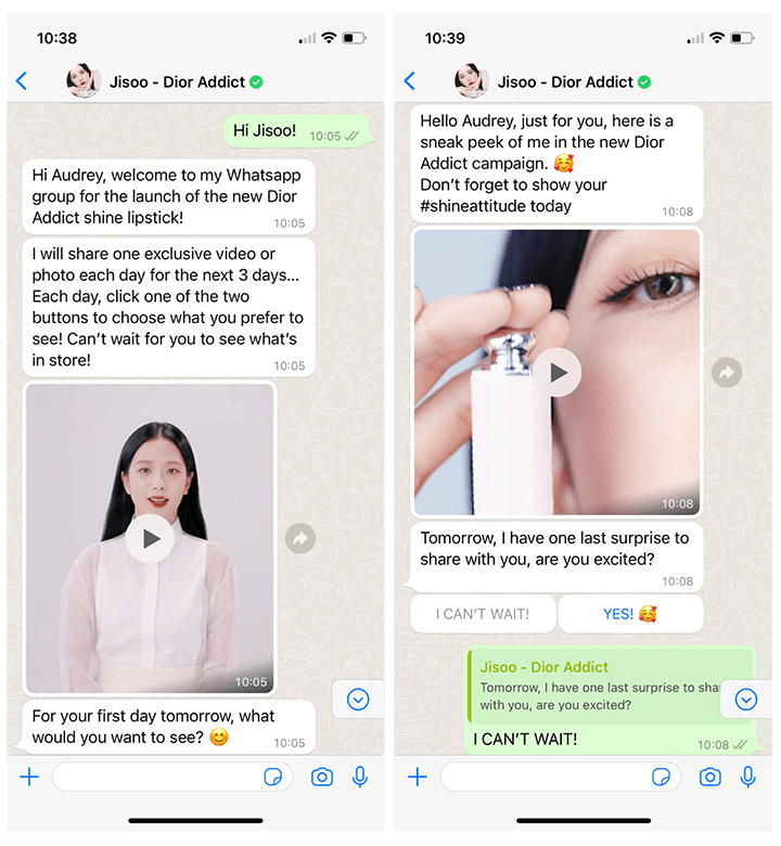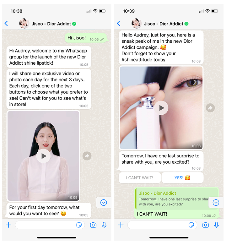 Los clientes son invitados a formar parte de esta experiencia a través de las Historias de Instagram de @diorbeauty, donde Jisoo ofrece a sus seguidores unirse a su «grupo exclusivo de WhatsApp». Desde allí, se les dirige una landing page específica donde se registran para interactuar con el chatbot de Jisoo a través de WhatsApp antes del lanzamiento del nuevo labial Dior Addict Shine. Pueden elegir el tipo de contenido que quieren recibir, desde videos temáticos hasta imágenes exclusivas fuera de la actividad de Jissoo como embajadora de Dior.