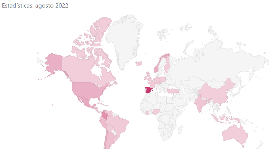 Este mes de Agosto hemos tenido un crecimiento de un 24,4% sobre el año 2021 y en línea sobre el mes anterior. Así que muy contento por el crecimiento. Y aquí una imagen curiosa, de dónde vienen mis usuarios. La zonas rosadas es donde he tenido visitas, nos asentamos en Latinoamérica y Estados Unidos. Mi top3 de este mes va para: España, Colombia y México.