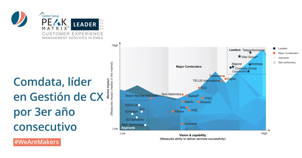 La calificación de Líder otorgada a Comdata para el segmento de Gestión de la Experiencia del Cliente (CMX) es el resultado de los logros alcanzados por la compañía tras el desarrollo de su oferta en las soluciones más vanguardistas del mercado de CX BPO, como los chatbots, el chat en vivo, Facebook Messenger, las herramientas para obtener el feedback del cliente y la analítica del habla.