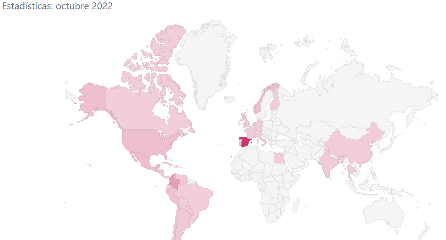 Este mes de Octubre hemos tenido un crecimiento de un 24,1% sobre el año 2021 y en línea sobre el mes anterior. Así que muy contento por el crecimiento. Y aquí una imagen curiosa, de dónde vienen mis usuarios. La zonas rosadas es donde he tenido visitas, nos asentamos en Latinoamérica y Estados Unidos. Mi top3 de este mes va para: España, Colombia y México.