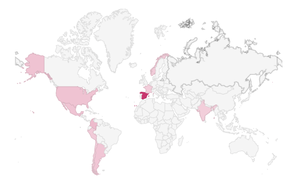Este mes de Noviembre se ha convertido en el mes más visitado de la historia del blog. Hemos tenido un crecimiento de un 38,0% sobre el año 2021 y una mejora del 18,9% sobre el mes anterior. Así que muy contento por el crecimiento. Y aquí una imagen curiosa, de dónde vienen mis usuarios. La zonas rosadas es donde he tenido visitas, nos asentamos en Latinoamérica y Estados Unidos. Mi top3 de este mes va para: España, Colombia y Estados Unidos.