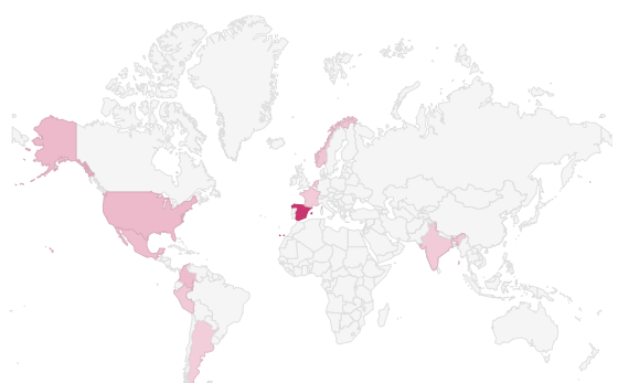 Este mes de Diciembre tenido un crecimiento de un 36,9% sobre el año 2021 y en línea con el mes anterior. Además este año 2022 ha sido el mejor año a nivel de visita en la web, un 15,7% más que el año pasado. Así que muy contento por el crecimiento. Y aquí una imagen curiosa, de dónde vienen mis usuarios. La zonas rosadas es donde he tenido visitas, nos asentamos en Latinoamérica y Estados Unidos. Mi top3 de este mes va para: España, Colombia y Estados Unidos.