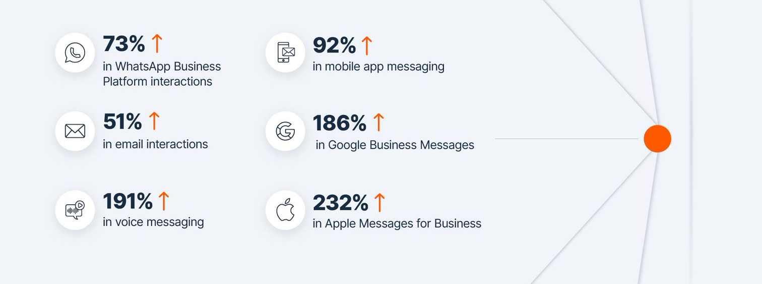 Sus datos de más de 449.000 millones de interacciones en 2022 revelan que la experiencia conversacional está volviéndose muy popular en todas las formas de comunicación con el cliente, desde ventas hasta atención al cliente.