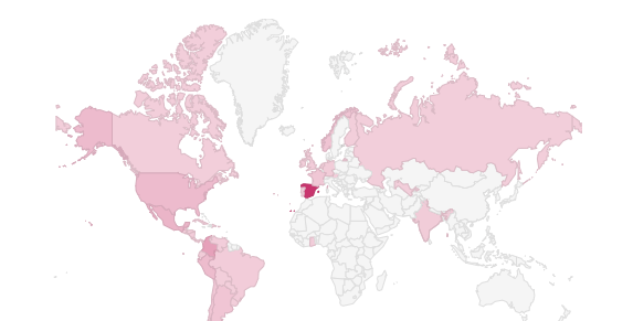 Este mes de Mayo hemos tenido un crecimiento de un 7,3% sobre el año 2022 y en línea sobre el mes anterior. Y aquí una imagen curiosa, de dónde vienen mis usuarios. La zonas rosadas es donde he tenido visitas, nos asentamos en Latinoamérica y Estados Unidos. Mi top3 de este mes va para: España, Colombia y México.