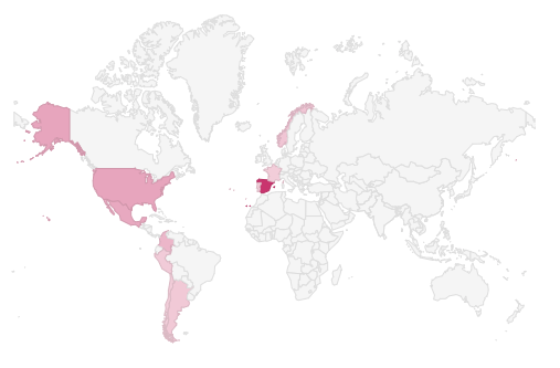 Este mes de Enero hemos ido en línea frente al mes anterior y en línea con el año pasado. Y aquí una imagen curiosa, de dónde vienen mis usuarios. La zonas rosadas es donde he tenido visitas, nos asentamos en Latinoamérica y Estados Unidos. Mi top3 de este mes va para: España, Estados Unidos y México.