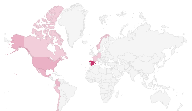 Este mes de Enero hemos ido en línea frente al mes anterior y en línea con el año pasado. Y aquí una imagen curiosa, de dónde vienen mis usuarios. La zonas rosadas es donde he tenido visitas, nos asentamos en Latinoamérica y Estados Unidos. Mi top3 de este mes va para: España, Estados Unidos y México.