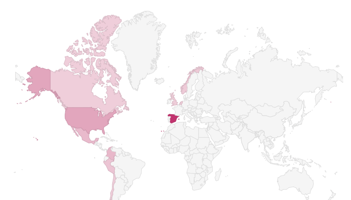 Este mes de Marzo hemos ido en línea frente al mes anterior y en línea con el año pasado. Y aquí una imagen curiosa, de dónde vienen mis usuarios. La zonas rosadas es donde he tenido visitas, nos asentamos en Latinoamérica y Estados Unidos. Mi top3 de este mes va para: España, Estados Unidos y México.