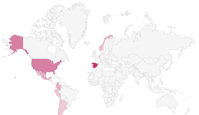 Este mes de Abril hemos crecido un 5% sobre el mes anterior y un 12.3% respecto al año pasado. Y aquí una imagen curiosa, de dónde vienen mis usuarios. La zonas rosadas es donde he tenido visitas, nos asentamos en Latinoamérica y Estados Unidos. Mi top3 de este mes va para: España, Estados Unidos y México.