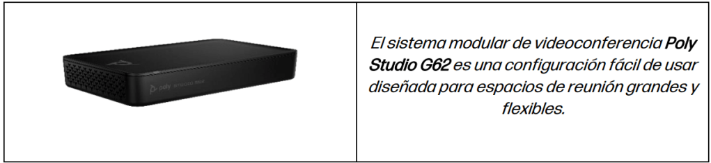 El Poly Studio G62 es un sistema de videoconferencia modular que incorpora vídeo y audio de calidad profesional a espacios grandes y flexibles. Gracias a su diseño modular, el Poly Studio G62 se integra a la perfección con diversos periféricos como cámaras, micrófonos y mandos, lo que lo convierte en una solución ideal para salas de reuniones, aulas y espacios flexibles.
