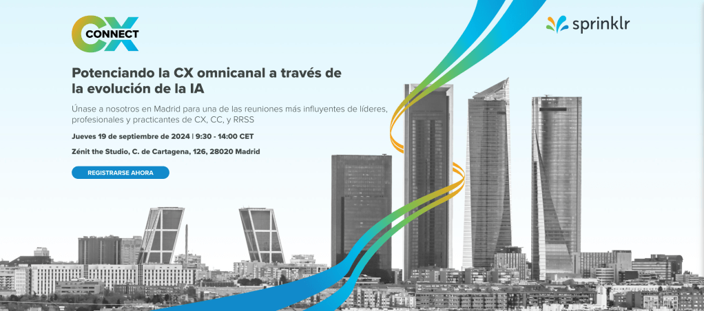 CX Connect tendrá lugar el próximo jueves 19 de septiembre de 2024 de 9:30 a 14:00 en Zénit the Studio (Cartagena 126, 28020 Madrid). El acceso es gratuito bajo invitación previa del equipo de Sprinklr.