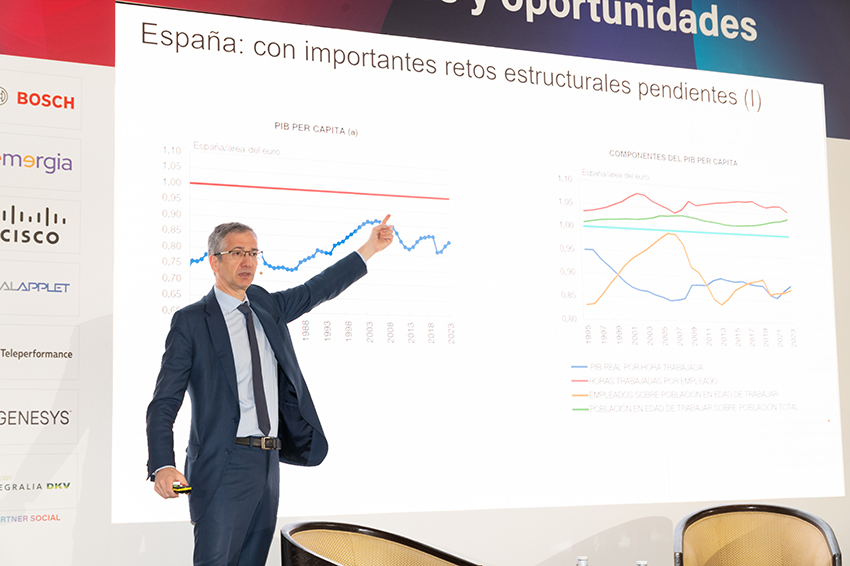 El primero de los intervinientes fue Pablo Hernández de Cos, ex gobernador del Banco de España y profesor de IESE Business School, quien dio su visión sobre las perspectivas económicas para Estados Unidos, la Unión Europea y España. Para el caso de nuestro país, resaltó sus dificultades para converger con nuestros socios comunitarios en términos de PIB por hora trabajada, debido a la baja productividad que se encuentra enraizada en nuestro sistema laboral.