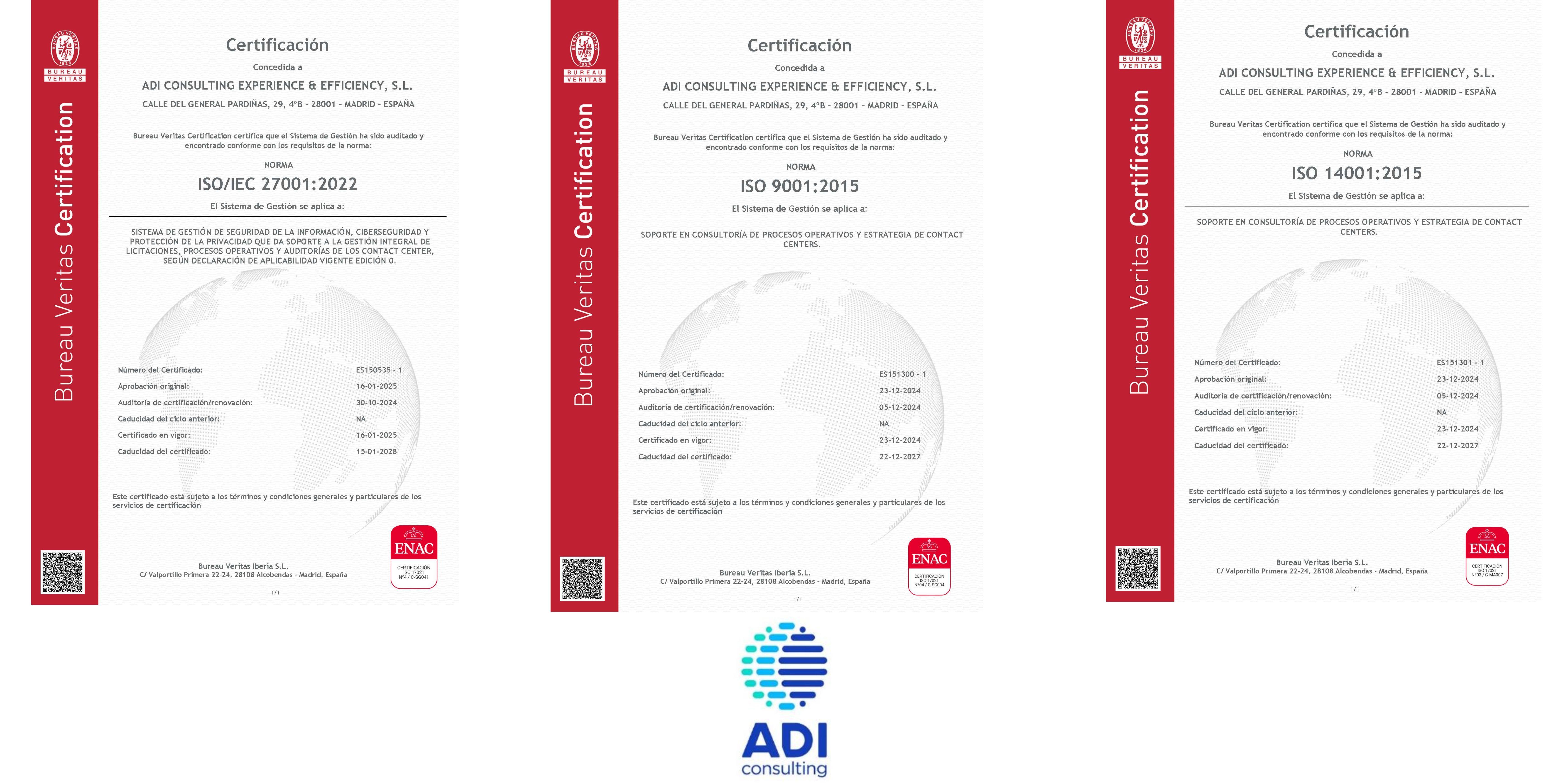 Con estas certificaciones, ADI Consulting refuerza su apuesta por desarrollar Contact Centers Eficientes para sus clientes, garantizando operaciones más ágiles, seguras, sostenibles y optimizadas.
