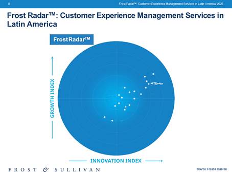 - El FROST RADAR™ 2025 ha reconocido a Atento como líder en el mercado de gestión de experiencia del cliente en América Latina por quinto año consecutivo, destacando su evolución hacia un modelo BTO basado en resultados de negocio