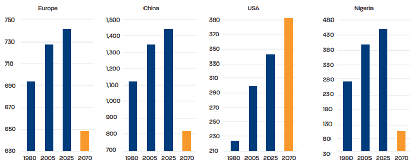 Evolución de la población en Europa, China, Estados Unidos y Nigeria entre 1980 y 2070.