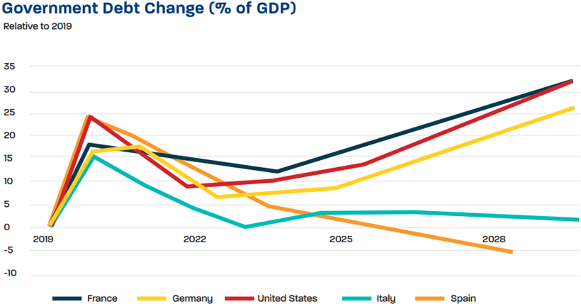 Incremento de la deuda pública respecto a 2019 en Francia, Alemania, Estados Unidos, Italia y España, en porcentaje del PIB