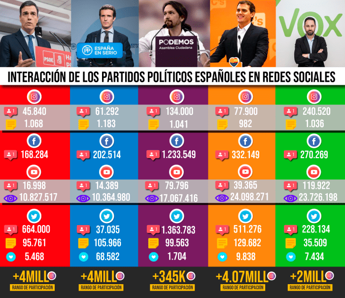 Ciudadanos destaca en el uso de redes sociales, contando con el mayor rango de participación en Instagram y liderando el número de visualizaciones en YouTube.Vox cuenta con el mayor número de seguidores en Instagram y YouTube, mientras que Podemos registra más seguidores tanto en Facebook como en Twitter. Desde hace tiempo, las redes sociales han … Continuar leyendo 28-A en redes sociales, cómo son los perfiles de cada uno de los partidos de cara a las elecciones generales del próximo domingo.